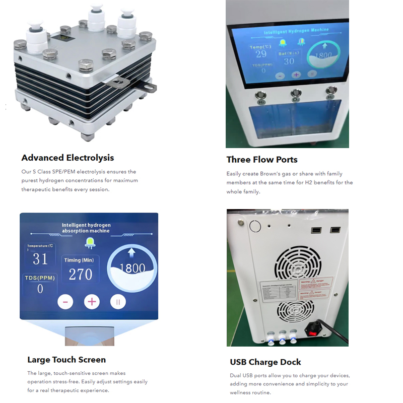 The Hydrogen Inhalation Machine is with the latest SPE(Solid Poly Electrolytic technology) + PEM(Proton Exchange Membrane) Dual Chamber solution. It has strong pressure resistance, strong hydrogen production ability, and does not produce harmful gases such as residual chlorine and ozone.